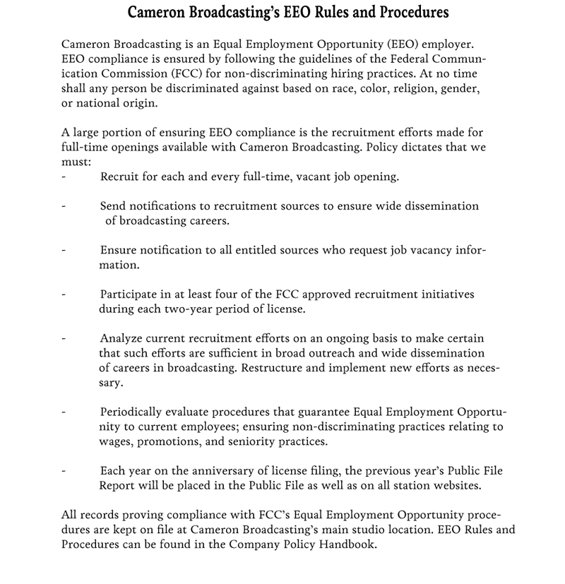 CAMERON BROADCASTING IS AN EQUAL OPPORTUNITY EMPLOYER